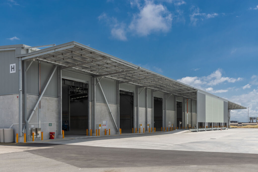 Design innovations included solar-powered lighting, recycled water systems, and bird-proofing features. Office fitout enhancements were added mid-project. Early demolition and earthworks prepared the brownfield site, while post-tension slab pours progressed efficiently. Reuse of trusted subcontractors from previous Port of Brisbane projects helped streamline delivery.